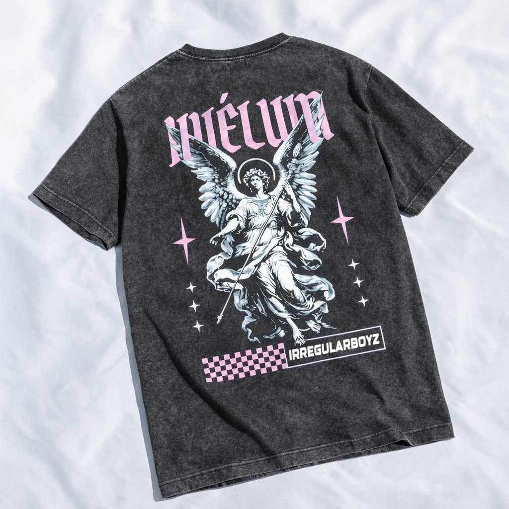 En la espalda destaca un diseño imponente de ángel en estilo clásico intervenido con estética urbana Y2K, acompañado de tipografía gótica en tono rosa y detalles gráficos que contrastan con la base oscura. El estampado de alta calidad garantiza definición, intensidad de color y gran durabilidad.